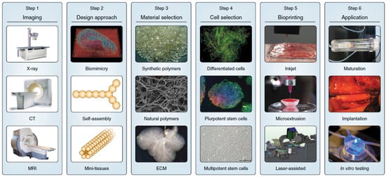 Typical six processes for 3D bioprinting: (1) imaging the damaged tissue and its environment to guide the design of bioprinted tissues/organs; (2) design approaches of biomimicry, tissue self-assembly and mini-tissue building blocks are sed singly and in combination; (3) the choice of materials (synthetic or natural polymers and decellularized ECM) and (4) cell source (allogeneic or autologous) is essential and specific to the tissue form and function; (5) bioprinting systems such as inkjet, microextrusion or laser-assisted printers; (6) tissue maturation in a bioreactor before transplantation or in vitro applications, courtesy of [24].