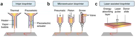 Schematic diagram of (a) thermal inkjet printers electrically heating the printhead to produce air-pressure pulses that force droplets from the nozzle, whereas acoustic printers using pulses formed by ultrasound pressure from piezoelectric element; (b) microextrusion printers using pneumatic or mechanical (piston or screw) dispensing systems to extrude bioink beads; and (c) laser-assisted printers utilizing focused laser beams on an absorbing substrate to propel bioink onto a collector substrate, courtesy of [24].