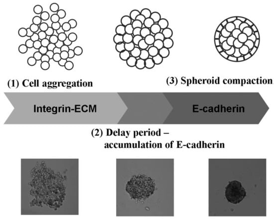 The processes of the spheroid formation: (1) formation of loose cell aggregates via integrin-ECM binding; (2) a delay period for cadherin expression and accumulation; (3) formation of compact spheroids through hemophilic cadherin-cadherin interactions, courtesy of [46].