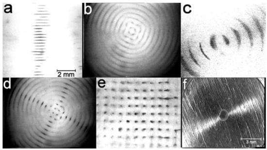 Cell aggregation under ultrasound standing wave and view normal to sound propagation (a) column of discoid aggregates in a plane cylindrical resonator; (b) initial pattern in tubular resonator-concentric cylinders; (c) aggregates of different sizes in a tubular resonator; (d) in plane and tubular resonator; (e) in a pair of two transducers perpendicular to each other; and (f) view in the direction of sound propagation of 3D RBC aggregate in the center of half-wavelength resonator, courtesy of [71].
