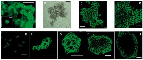 (A) Epifluorescence micrograph of 3D HepG2 aggregates by ultrasound standing wave and F-actin stained with Phalloidin-Alexa 488 with junctional F-actin marked with arrowheads (bar 25 μm) and an unsonicated single cell shown in inset (bar 10 μm); (B) aggregate maintained on a P-HEMA-coated surface after 1 day under light microscope, confocal micrograph of F-actin staining after 1 day (C) and 18 days (D); and confocal micrograph of F-actin staining in gyrotatory-produced aggregates after (E) 2 h; (F) 1 day; (G) 3 days; (H) 9 days and (I) 18 days (B–I, bar 50 μm), courtesy of [77].