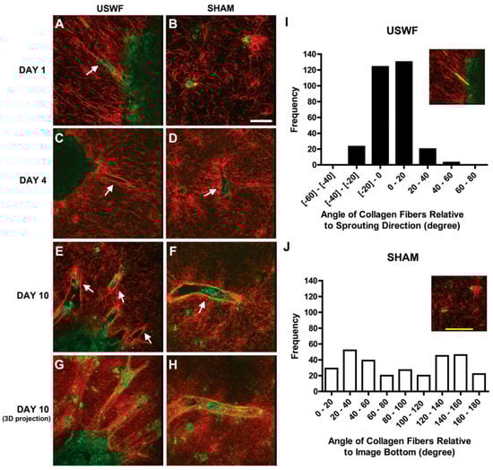Intrinsic cellular autofluorescence in second-harmonic generation microscopy of endothelial cell bands (green) suspended in unpolymerized collagen type-I fibers (red) on (A,B) day 1; (C,D) day 4; and (E,F) day 10 incubation treated by ultrasound standing wave field (USWF) or sham-exposure, arrows show endothelial cell sprouts in scale bar of 50 μm, and the histograms of the occurrence frequency of collagen fiber angles in (I) USWF- and (J) sham-exposed constructs. collagen gels, courtesy of [76].