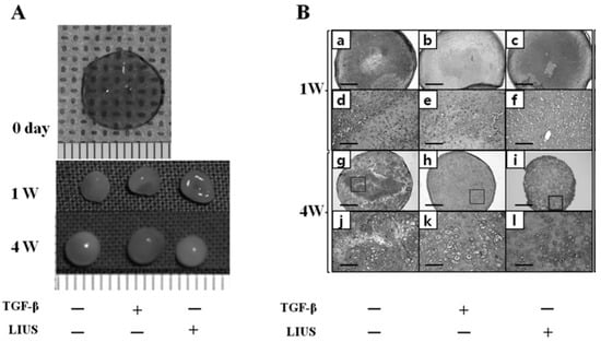 Effect of low-intensity ultrasound (LIUS) on the chondrogenesis of rabbit MSCs seeded in fibrin-HA and cultured in chondrogenic-defined medium untreated, treated with TGF-β3 (10 ng/mL), or treated with LIUS (100 mW/cm2) for 1 and 4 weeks, (A) the gross images of the constructs at 0, 1, and 4 weeks in scale bar of 1 mm; and (B) images of safranin-O/fast green staining in scale bar of 1 mm for (a–c,g–i), 200 mm for (d–f,j–l), courtesy of [120].