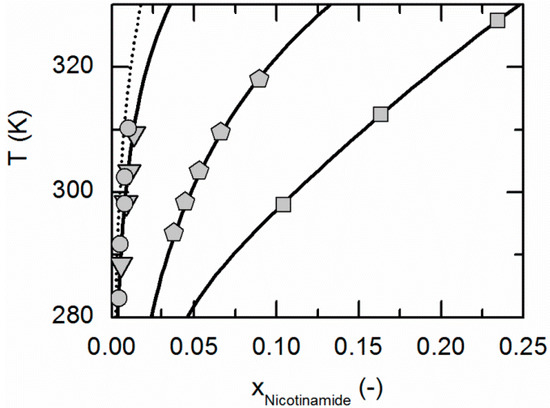 Solubility of nicotinamide in ethyl acetate (circles, dotted line), acetonitrile (triangles), ethanol (pentagons) and water [59] (squares). All lines correspond to the PC-SAFT correlations; symbols represent the experimental data points.