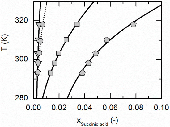 Solubility of succinic acid in ethyl acetate (circles, dotted line), acetonitrile [26] (triangles), ethanol [26] (pentagons) and water [26] (squares). Lines correspond to the PC-SAFT correlations; symbols represent the experimental data points.