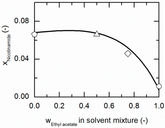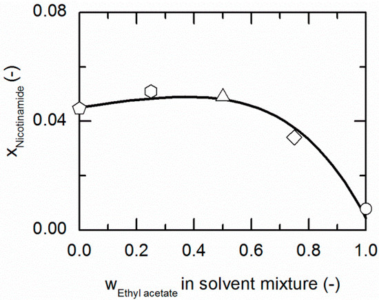 Solubility of nicotinamide (NA) in ethanol/ethyl acetate mixtures at 310.15 K. The line correspond to the PC-SAFT prediction; symbols represent the experimental data points for NA in ethanol (pentagon), in the ethanol/ethyl acetate (solute-free) mixtures 0.5/0.5 w/w (up-pointing triangle), 0.25/0.75 w/w (diamond) and in ethyl acetate (circle).