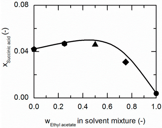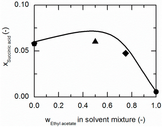 Solubility of succinic acid (SA) in ethanol/ethyl acetate mixtures at 310.15 K. The line correspond to the PC-SAFT prediction; symbols represent the experimental data points for SA in ethanol (pentagon), in the ethanol/ethyl acetate (solute-free) mixtures 0.5/0.5 w/w (up-pointing triangle), 0.25/0.75 w/w (diamond) and in ethyl acetate (circle).