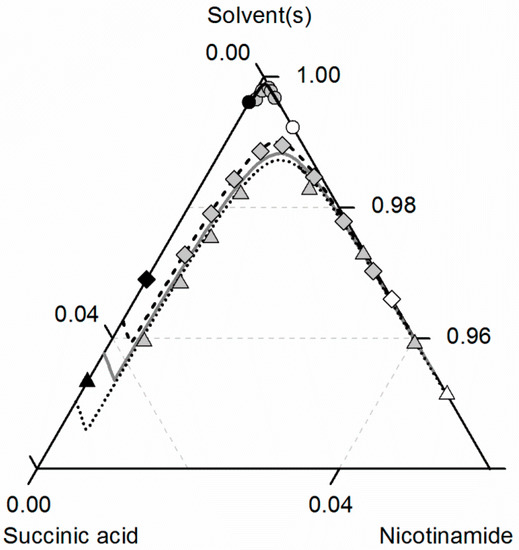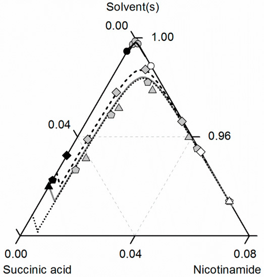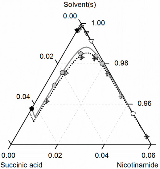 Solubilities of nicotinamide (NA) and succinic acid (SA) and the corresponding 2:1 cocrystal (CC) in ethanol (pentagons, gray solid lines), acetonitrile (triangle pointing downwards, black solid lines) and an ethanol/acetonitrile mixture 0.67/0.33 w/w (crossed triangle pointing to the right, black dotted lines) at 298.15 K with shortened axes in mole fractions. Lines correspond to the PC-SAFT predictions; symbols refer to the experimental data points of SA (black), the CC (gray) and NA (white).