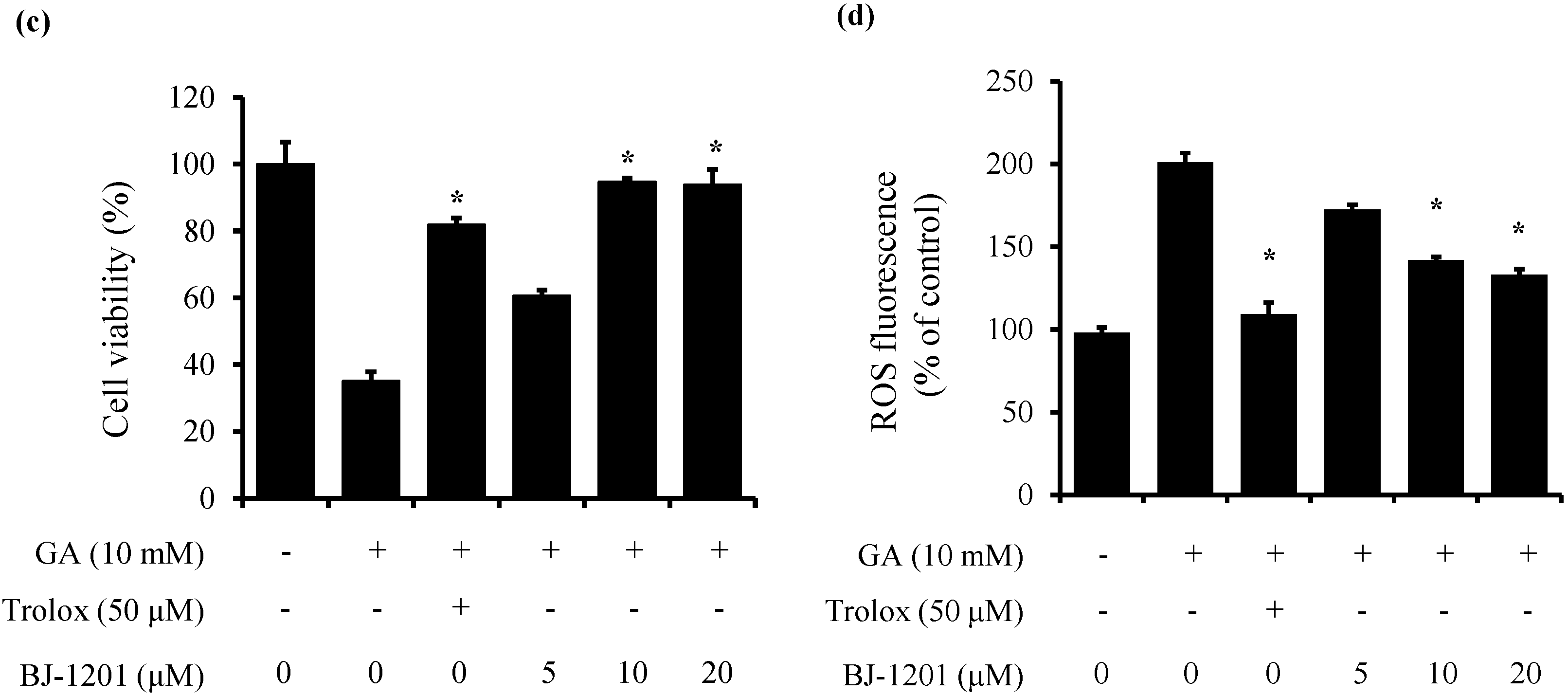 Effects of BJ-1201 on glutamate-induced oxidative neurotoxicity. (a) The structure of BJ-1201; (b) HT22 cells were incubated for 72 h with various concentration of BJ-1201; (c) HT22 cells were pre-treated with BJ-1201 for 12 h and then incubated for 12 h with glutamate (10 mM). Cell viability was measured by MTT assay; (d) Exposure of HT22 cells to glutamate increased ROS production. Each bar represents the mean ± S.D. of three independent experiments. * p < 0.05 compared with glutamate. Trolox (100 μM) was used as the positive control.