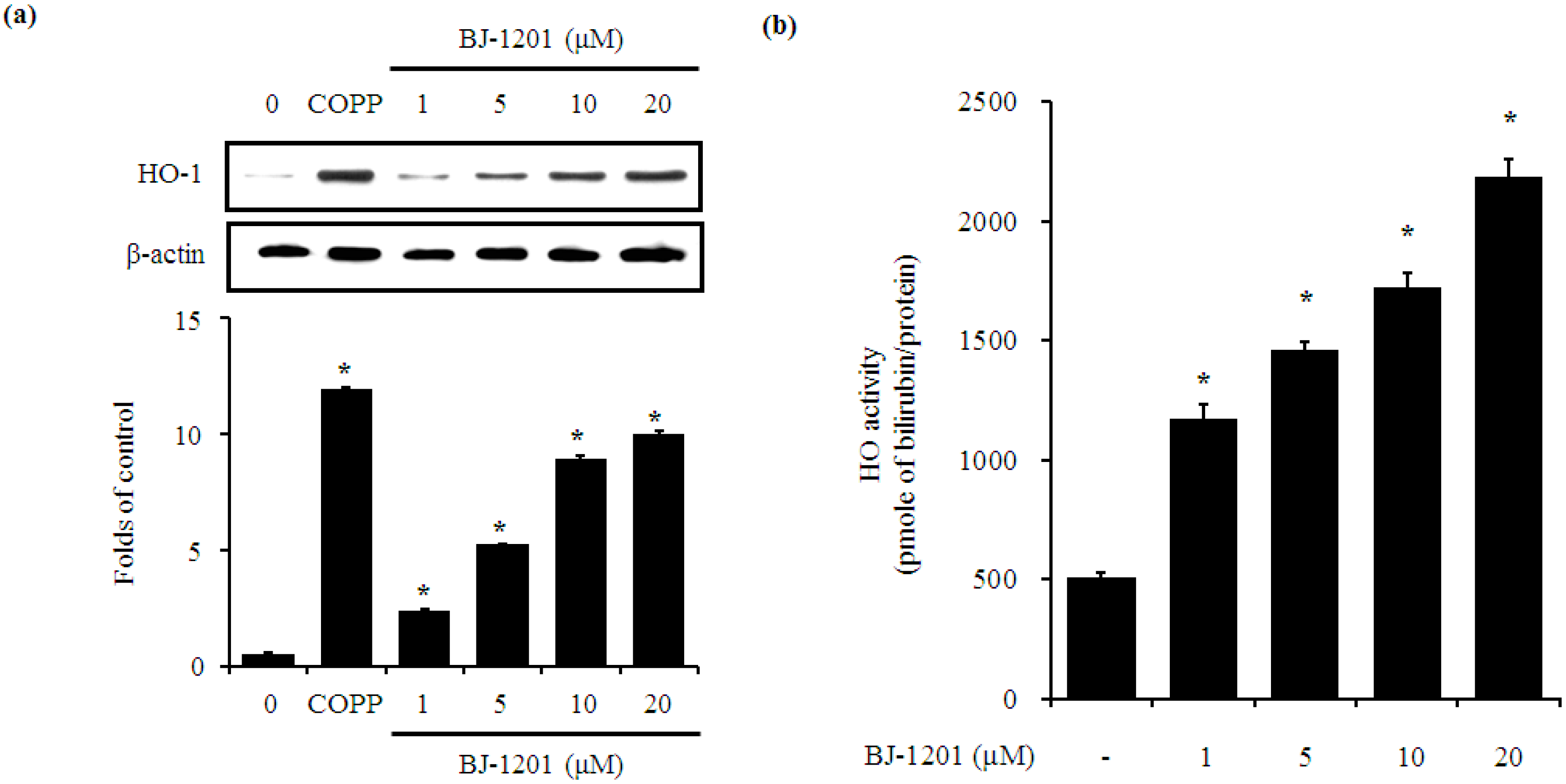 In line with the increase in protein expression of HO-1 by BJ-1201, BJ-1201 treated cells showed higher enzymatic activity of HO in a dose-dependent manner (Figure 2b). These results demonstrate that BJ-1201 directly affects HO-1 protein levels.