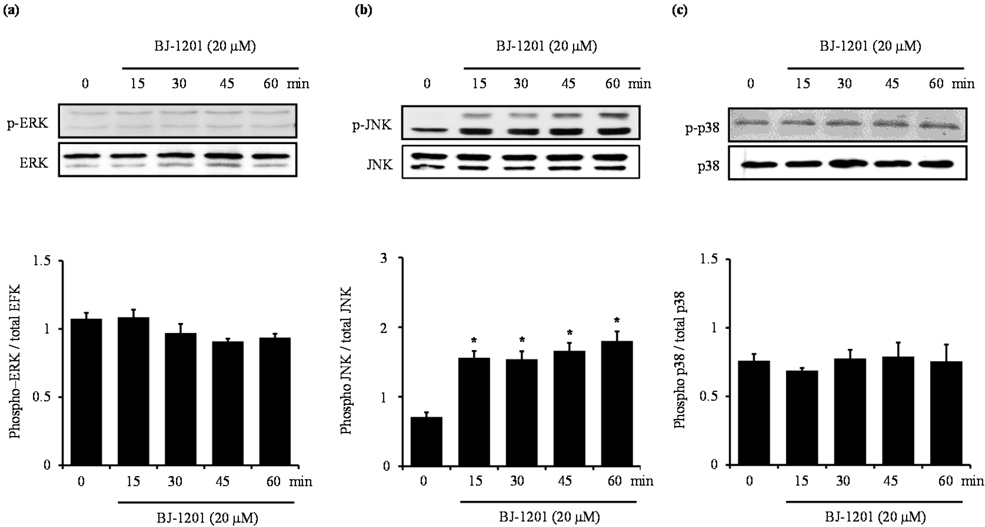Effects of BJ-1201-induced MAPK activation in HT22 cells. Cells were treated with 20 μM BJ-1201 for the indicated times. Cell extracts were analyzed by western blot with antibodies specific for (a) phosphorylated ERK1/2 (p-ERK); (b) phosphorylated JNK (p-JNK); or (c) phosphorylated p38 (p-p38). Membranes were stripped and re-probed for the total form of each MAPK as a control, and representative blots of three independent experiments are shown. Each data represents the mean ± S.D. of three independent experiments are shown. * p < 0.05 compared with control group.