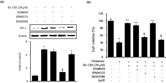 Effects of BJ-1201 on MAPK dependent HO-1 expression and cytoprotection in HT22 cells. (a) Cells were pretreated for 1 h with the specific inhibitor PD98059 (40 μM), SB203580 (20 μM), and SP600125 (25 μM), and then treated with 20 μM BJ-1201 for 18 h. Western blotting was then performed with HO-1 antibody; (b) Cells were treated with 20 μM BJ-1201 in the presence or absence of each specific inhibitors and SnPP (50 μM) for 12 h were exposed to 5 mM glutamate for 12 h. Data represent the mean ± S.D. of three independent experiments. * p < 0.05 compared with control group. # p < 0.05 compared with BJ-1201. ** p < 0.05 compared with glutamate (10 mM). $ p < 0.05 compared with glutamate + BJ-1201.