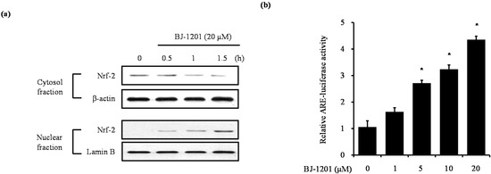 We examined whether BJ-1201 induced nuclear translocation of Nrf2 in HT22 cells (Figure 5a,b). The cells were treated with BJ-1201 (20 μM) for 0.5, 1, or 1.5 h. Nrf2 levels in the cytosolic fraction decreased in response to treatment.