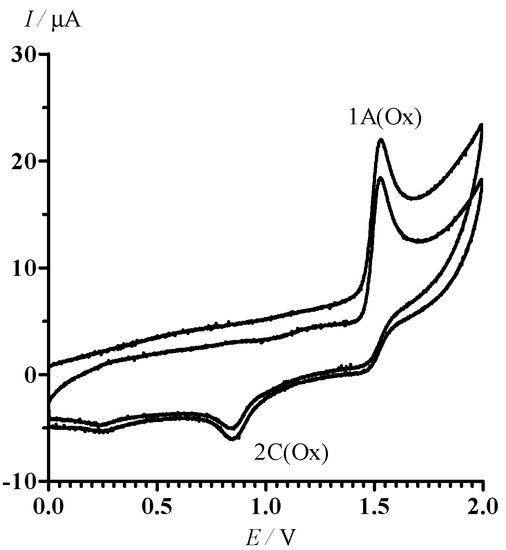 CV of 13 in oxidative area of potentials is characterized by the only irreversible peak 1A (Ox) at the potential = 1.53 V (Figure 4). An additional irreversible peak 2C (Ox) ( = 0.85 V) corresponding to the reduction of oxidation products of 13 is observed in the cathode branch of the CV.