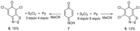 In the previous study on six-membered oximes, p-benzoquinone monooxime 7 gave a complex mixture of products on reaction with S2Cl2 and the desired fused dithiazole was obtained in a low yield [13]. We have found that the treatment of 7 with S2Cl2/pyridine in MeCN leads selectively to dichloro dithiazole 8 or to trichloro dithiazole 9 depending on the molar excess of the reagents. In boiling MeCN, reaction with a larger excess (S2Cl2, 6 equiv; pyridine, 8 equiv) gave 9, whereas with a smaller excess (S2Cl2, 3 equiv; pyridine, 4 equiv) 8, in both cases, however, in low yields (Scheme 4).