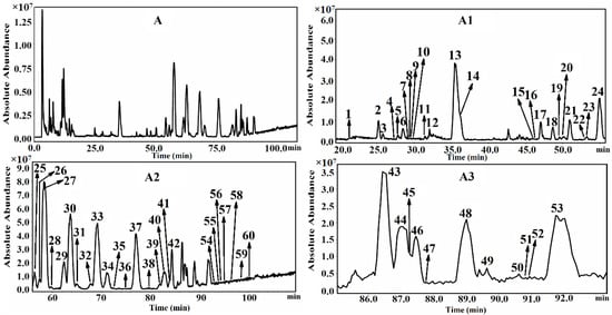 The TIC of Jilin GRR in negative ion detection mode (A) and its corresponding amplified chromatograms (A1, A2, A3).