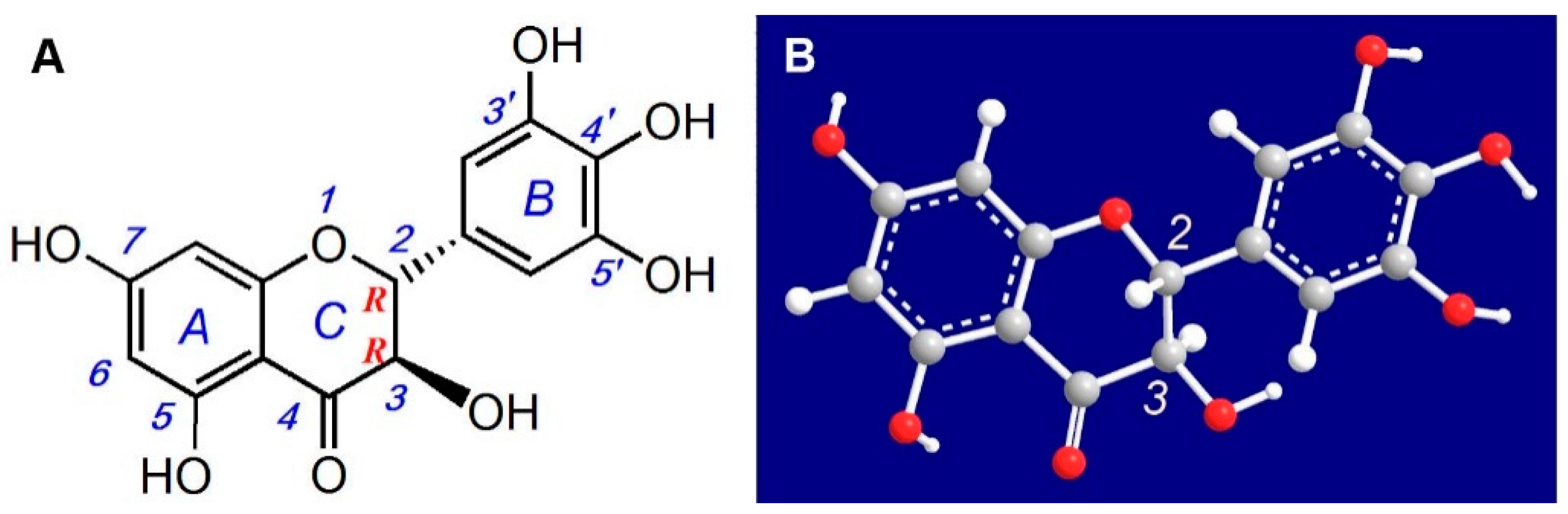 Herein, we use a ball-stick model to intuitively show the stereo configuration of DHM. As illustrated in Figure 1B, the absolute configurations of C-2 and C-3 are (R,R), and the full IUPAC name of DHM is (2R,3R)-3,5,7,3’,4’,5’-hexahydroxy-2,3-dihydroflavonol. Our detailed drawing should be helpful to understand the role of the 3–OH in DHM and other dihydroflavonoids. Furthermore, this work will support the screening of natural dihydroflavonoids and their synthetic derivatives as effective antioxidants for cell transplantation and tissue engineering purposes.