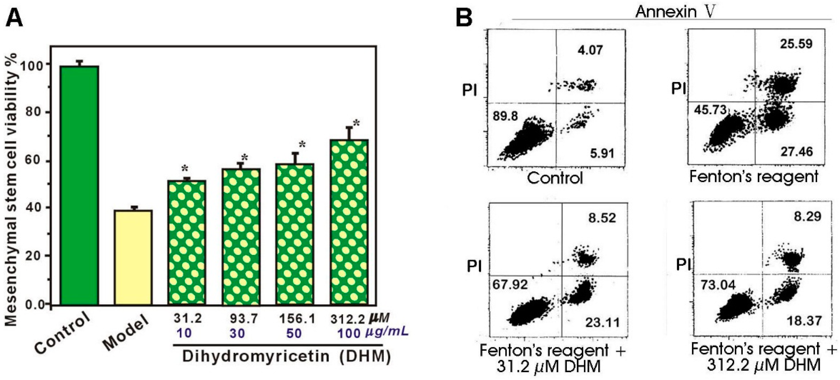 As a main flavonoid, dihydromyricetin (DHM, Figure 1A) occurs in Ampelopsis grossedentata (Hand-Mazz.) [8], and has attracted increasing attention owing to its beneficial effect on cells. It has been recently reported that DHM can protect endothelial cells from H2O2-induced oxidative damage via mitochondrial pathways [9], and exert antioxidant action in soybean oil and cooked ground beef model systems [10]. Additionally, the parent plant A. grossedentata has been consumed as a tea (Rattan Tea, Vine Tea, Tengcha) with health benefits in South China [11,12]. It is documented to be able to clear heat and remove toxic in the body according to Tradition Chinese Medicine (TCM) [11]. The so-called heat and toxic properties in TCM have been demonstrated by free radical biology to result from oxidative stress induced by ROS, especially the •OH radical [13]. Taken together, these observations suggest that DHM may possess a beneficial effect on the apoptosis of MSCs, although to our knowledge, there is no direct evidence to support this. Therefore, we investigated the beneficial effects of DHM on the viability of •OH-treated MSCs using the MTT [3-(4,5-dimethylthiazol-2-yl)-2,5-diphenyl] assay and flow cytometry analysis.
