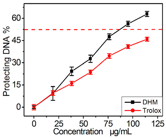Additionally, such protection has been demonstrated to be partly attributed to the repair of DNA oxidative damage [24]. As shown in Figure 3, DHM exhibited a protective effect against DNA damage in a concentration-dependent manner in vitro. Its protective effect on DNA is reported to be directly associated with its fast repairing DNA radical and ROS scavenging (antioxidant) effect [25], and may be partly responsible for its anticancer effect because cancer and aging are closely related to •OH radical-induced damage to cells and DNA [14,26,27].