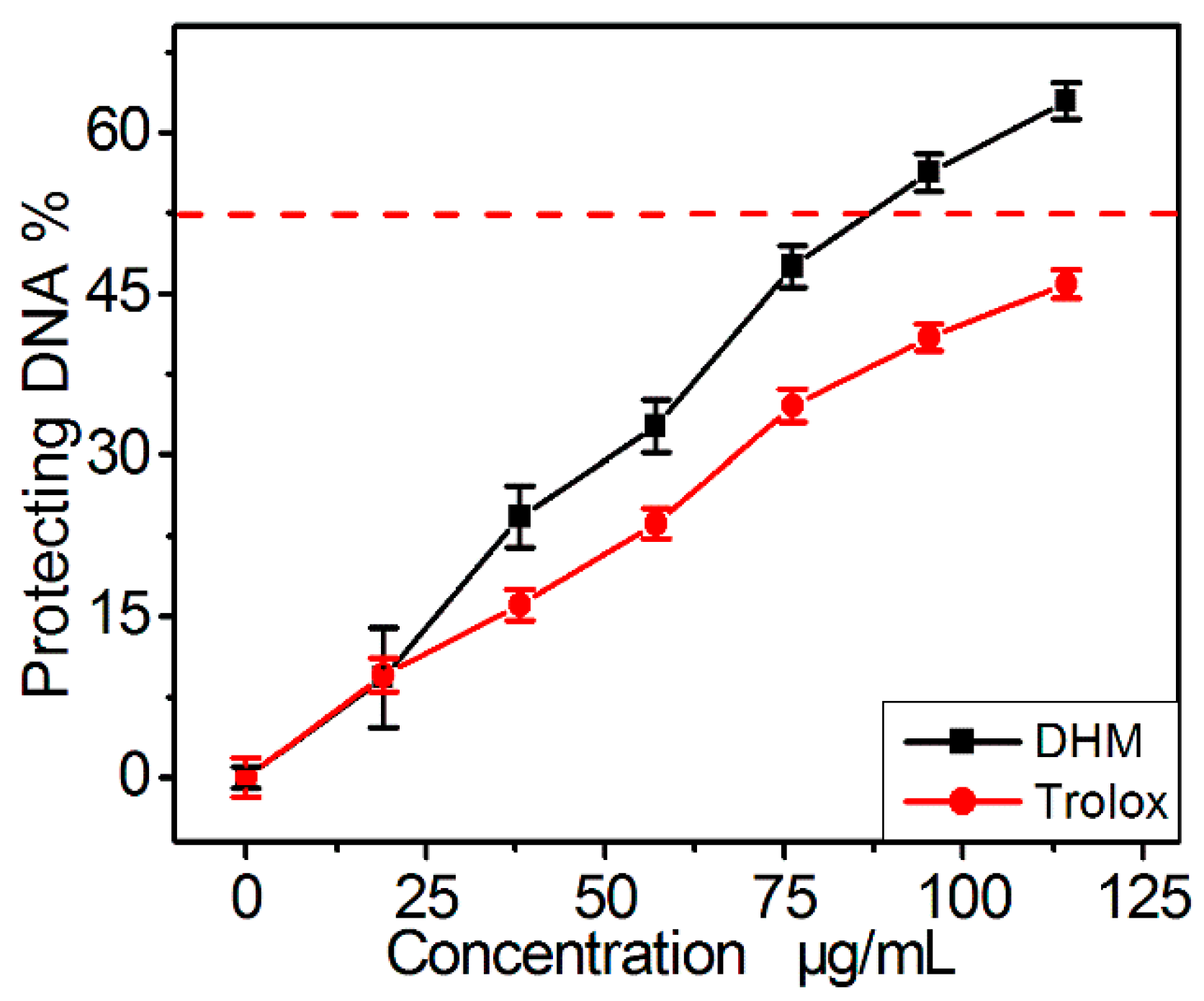 The protective effect of dihydromyricetin (DHM) against •OH-induced DNA damage in vitro. Each value is expressed as the mean ± SD (n = 3).