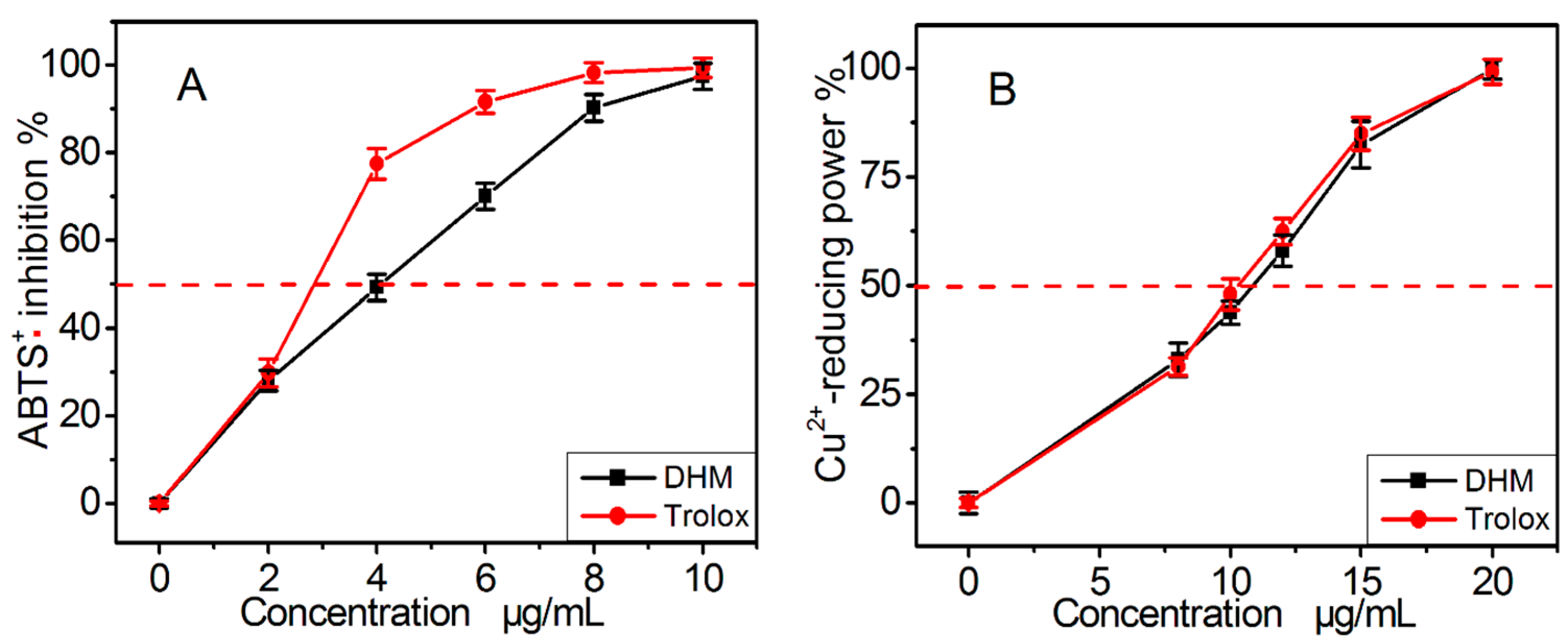 The dose response curves of dihydromyricetin (DHM) and positive control Trolox in the ABTS•+ radical-scavenging assay (A) and Cu2+-reducing power assay (B). Each value is expressed as the mean ± SD (n = 3). Trolox, [(±)-6-hydroxyl-2,5,7,8-tetramethlychroman-2-carboxylic acid].