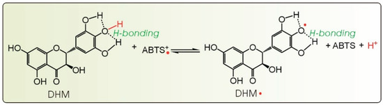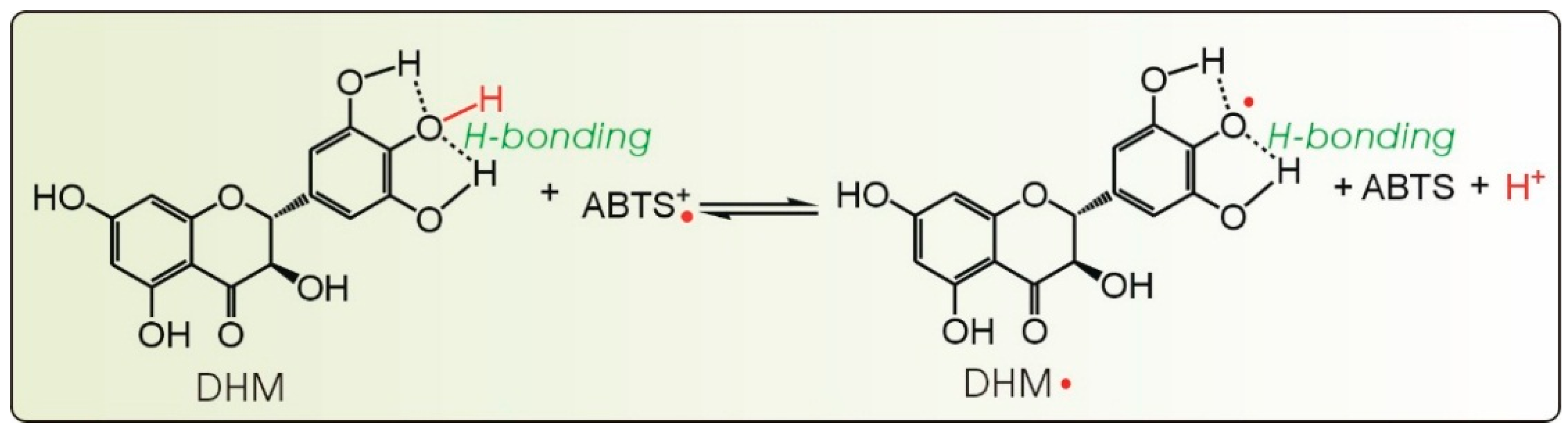 In addition to the ET pathway, an atom transfer pathway has also been reported to play a role in the antioxidant action of phenolics [34]. Atom transfer can be further classified into several subtypes: hydrogen atom transfer (HAT), concerted proton-coupled electron transfer (CPCET), electron transfer followed by proton transfer (ET-PT), proton transfer followed by electron transfer (PT-ET), and sequential proton loss electron transfer (SPLET) among others [35]. As a stable free radical, DPPH• can be reduced by phytophenols to DPPH-H (Equation (3)) [36]. This is demonstrated to be an atom transfer [37], and thus, we analyzed the DPPH• scavenging ability of DHM: