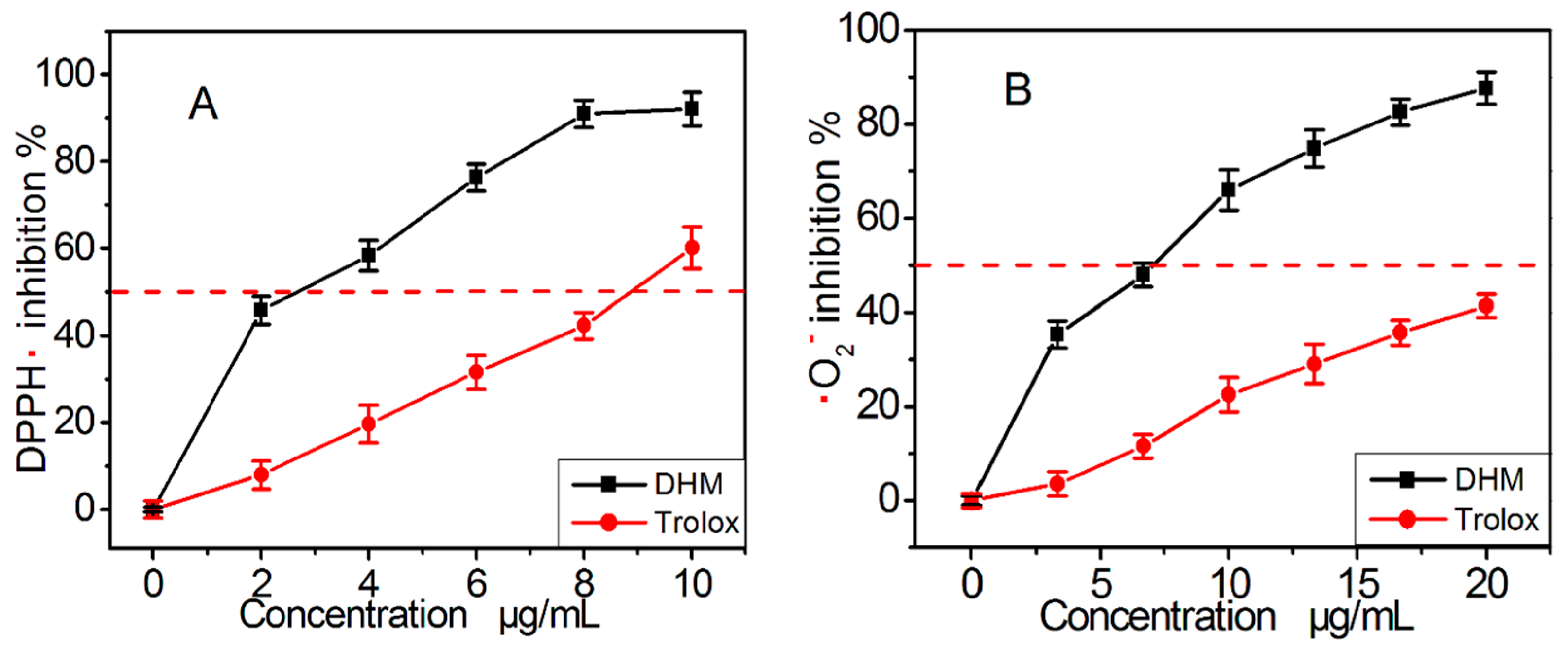The dose response curves of dihydromyricetin (DHM) and the positive control Trolox in the DPPH• scavenging assay (A) and •O2− scavenging assay (B). Each value is expressed as the mean ± SD (n = 3). Trolox, [(±)-6-hydroxyl-2,5,7,8-tetramethlychroman-2-carboxylic acid].