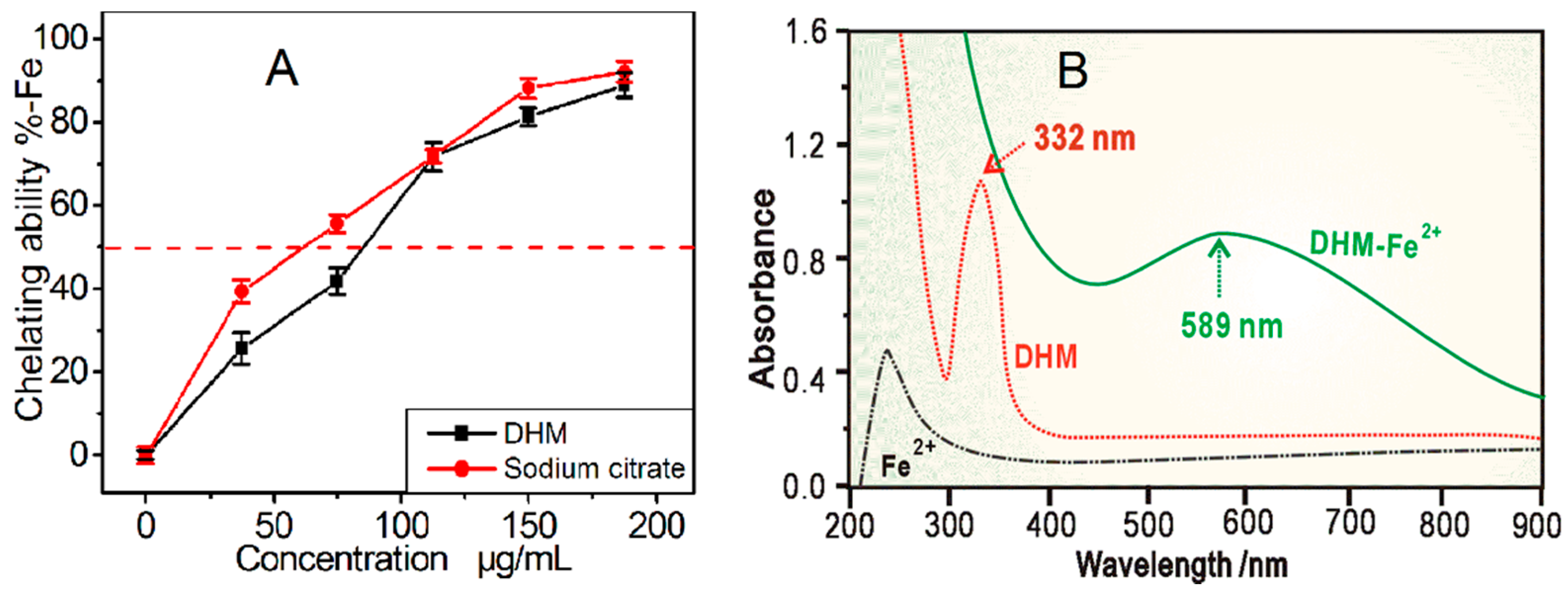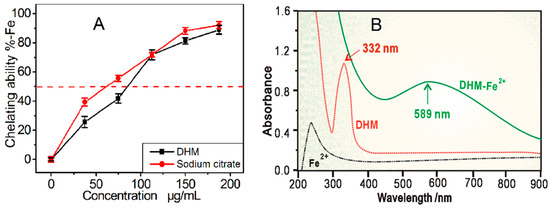 (A) The dose response curve of DHM in the Fe2+-chelating assay. Sodium citrate is used as the positive control. Each value in (A) is expressed as the mean ± SD (n = 3); (B) UV spectra of dihydromyricetin (DHM) and the DHM-Fe2+ complex.