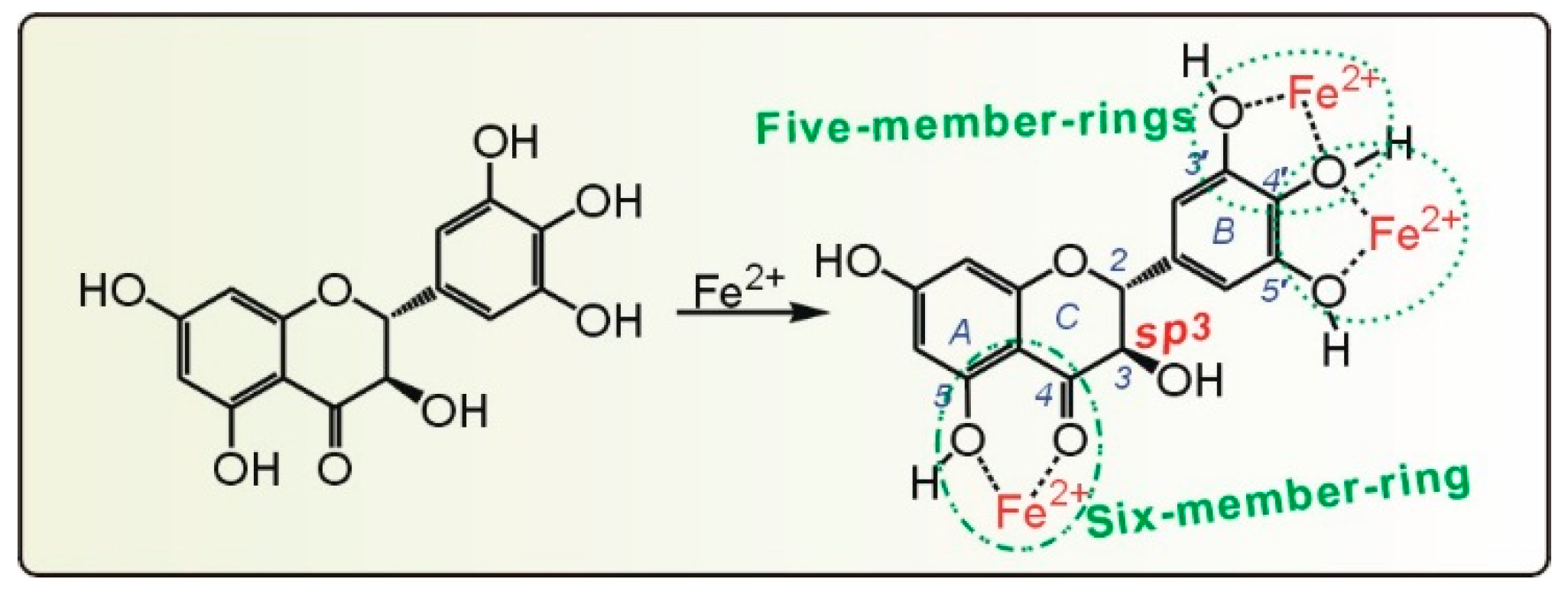 The proposed chelation of Fe2+ by dihydromyricetin (DHM).