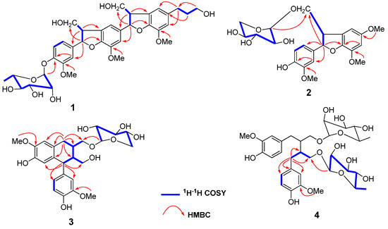 Key 1H-1H COSY and HMBC correlations of compounds 1−4.