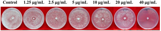Growth inhibition of P. noxius on potato dextrose agar (PDA) plates in the presence or absence of the serial concentration (1.25–40 μg/mL) of phenazine-1-carboxylic acid.