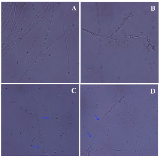Optical microscopy of P. noxius mycelia with or without PCA (40×). (A) Control; (B) 10 μg/mL; (C) 20 μg/mL; (D) 40 μg/mL.