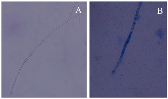 Moreover, the hyphal morphological changes were examined via optical microscopy, which indicated that treatment with PCA had a significant effect on mycelia growth (Figure 3). After the PCA treatment, fungal hyphae revealed irregularly swollen mycelia and short hyphae with increased septation and less branching compared to the control intact mycelium with normal branching and septation. In this study, P. noxius hyphea treated with PCA were stained with methylene blue to determine viability. PCA-treated hyphae (approximately 30% in 10 μg/mL or 80% in 20 μg/mL) retained the oxidized form of methylene blue because of the loss of the reducing capacity of the dead hyphae. However, the viable hyphae rapidly converted the methylene blue dye to its colorless form, leucomethylene blue, although the hyphae without PCA treatment showed a low level of staining with methylene blue (<3%). Therefore, this finding indicated a fungicidal effect of PCA (Figure 4). Except for abnormal fungal growth caused by PCA (Figure 3B–D), it obviously caused cell lysis or cell death at concentrations above 20 μg/mL.