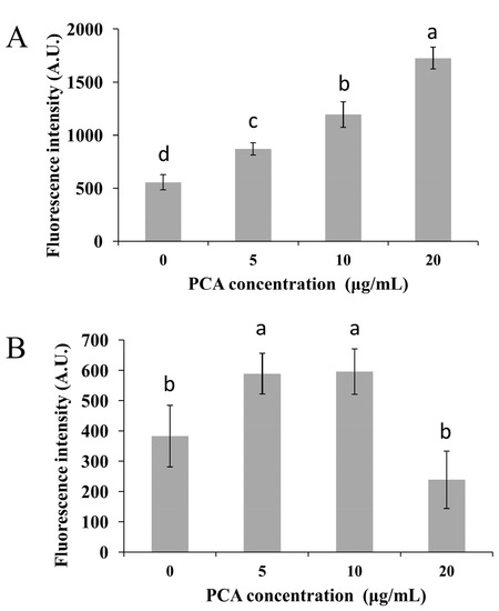 It is known that intracellular reactive oxygen species (ROS) are generated in cellular response to exogenous sources such as xenobiotics compounds and pathogen invasion as well as during mitochondrial oxidative metabolism [19]. To examine the intracellular ROS change by PCA, P. noxius protoplast cells were treated with PCA (0–20 μg/mL) for 1 h, and ROS levels were measured by using the cell-permeable substrate 2’,7’-dichlorodihydrofluorescein diacetate (DCFH-DA). As shown in Figure 5A, the intracellular ROS accumulation in P. noxius was obviously affected by PCA. We found that the ROS product differed in the presence of PCA (0–20 μg/mL) and resulted in a significant increase in the intracellular fluorescence when compared to the control, indicating a higher ROS production in the group treated with PCA. The relative intensity of fluorescence as measured by fluorescence microplate reader increased from 556 arbitrary units (AUs) for cells in the absence of PCA to 1726 AUs in the presence of 20 μg/mL of PCA. Our results indicated that PCA generates ROS in P. noxius.