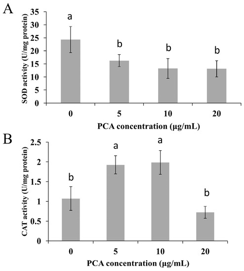 Effects of PCA on SOD (A) and CAT (B) in P. noxius. Values were presented as mean ± S.E. Data presented were the means of pooled data (n = 6). Values followed by a different lowercase letter are significantly different (p < 0.05).