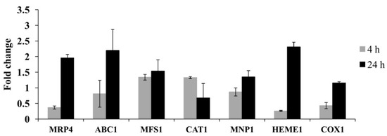 To determine if PCA was responsible for the change in gene expression, we selectively analyzed seven genes for qRT-PCR that are involved in cell detoxification, the oxidation-reduction process, and electron transport of the respiratory chain. The results are given in Figure 7; all seven genes were upregulated at all two time points in response to low-level PCA. Interestingly, the expression of genes at 24 h was more upregulated than those at 4 h. It is well known that the ATP-binding cassette (ABC) and the major facilitator superfamily (MFS) transporters can play a major role not only in fungicide sensitivity and resistance but also in the efflux of toxic components and metabolites from the cell [26]. Furthermore, they are involved in a large variety of molecular events such as protein secretion, nutrient uptake, and pathogenesis [27]. In this study, all three selected cellular transport-related genes were upregulated in response to PCA, suggesting that they could be involved in PCA detoxification in order to improve the cell viability.