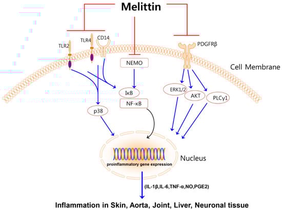 Major mechanisms for the anti-inflammatory activities of melittin. Melittin suppresses signal pathways of TLR2, TLR4, CD14, NEMO, and PDGFRβ. By inhibiting these pathways melittin decreases activation of p38, ERK1/2, AKT, PLCγ1 as well as translocation of NF-κB into the nucleus. This inhibition results in reduced inflammation in skin, arota, joint, liver, and neuronal tissue. TLR, toll-like receptor; CD, cluster of differentiation; NEMO, nuclear factor kappa-B essential modulator; PDGFRβ, Platelet-derived growth factor receptor beta.