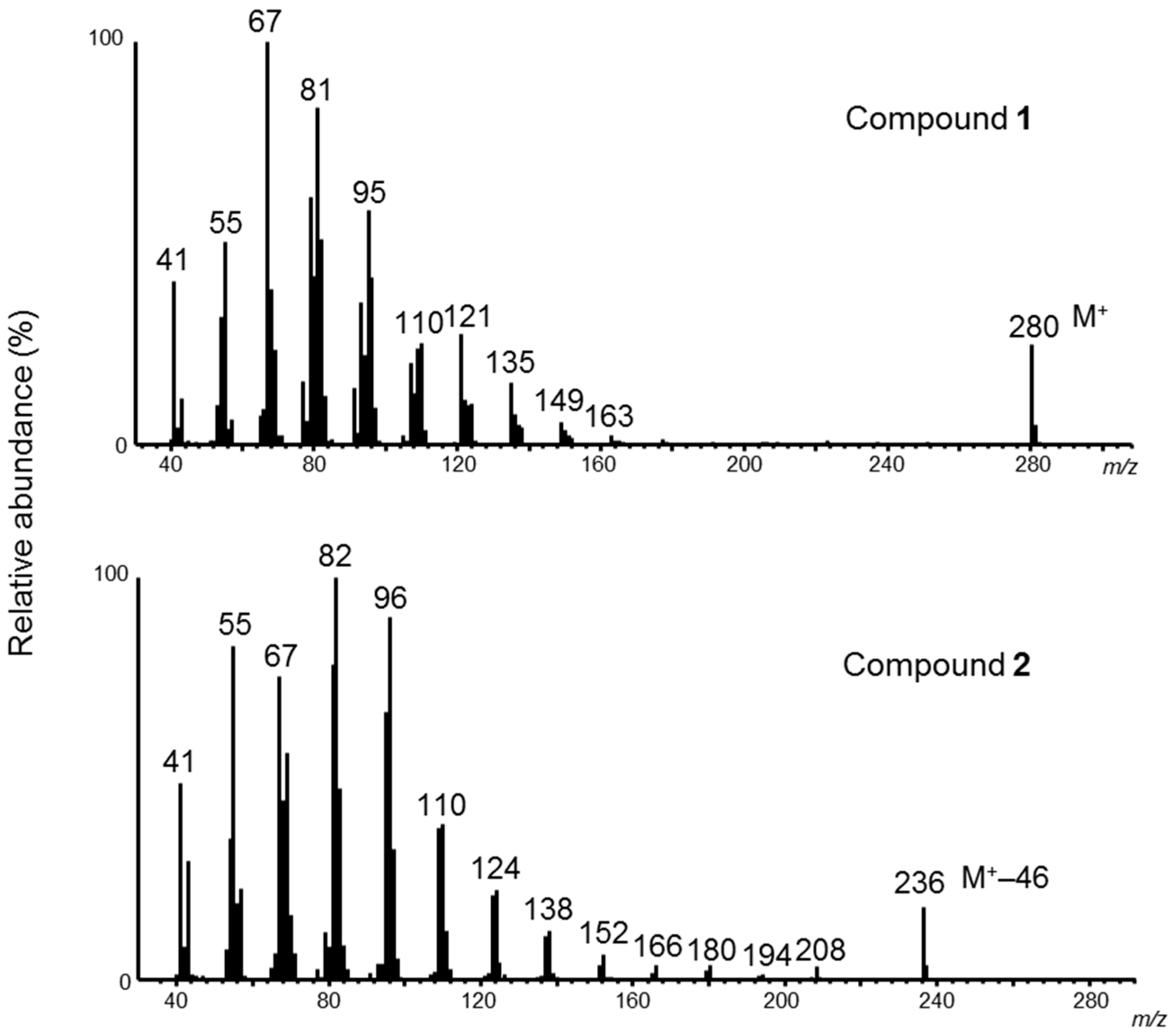 When analyzing the hexane-extracted components of the opisthonotal gland secretions from Sancassania sp. Sasagawa by GC-MS, compounds 1 and 2 were detected at retention times of 18.912 min and 18.953 min, respectively. As presented in Figure 1, observation of the characteristic ion at m/z 280 and base peak ion at m/z 67 in the MS spectrum of compound 1 is possible, and from the S-shaped decrease in each fragment ion from the base ion to the m/z 280 ion, we speculated that compound 1 is a straight-chain fatty acid derived compound. The MS spectrum of compound 2 also shows an S-shaped decline in each fragment ion from the m/z 82 base peak ion to the characteristic m/z 236 ion, which led us to speculate that like compound 1, compound 2 is a straight-chain fatty acid derived compound.