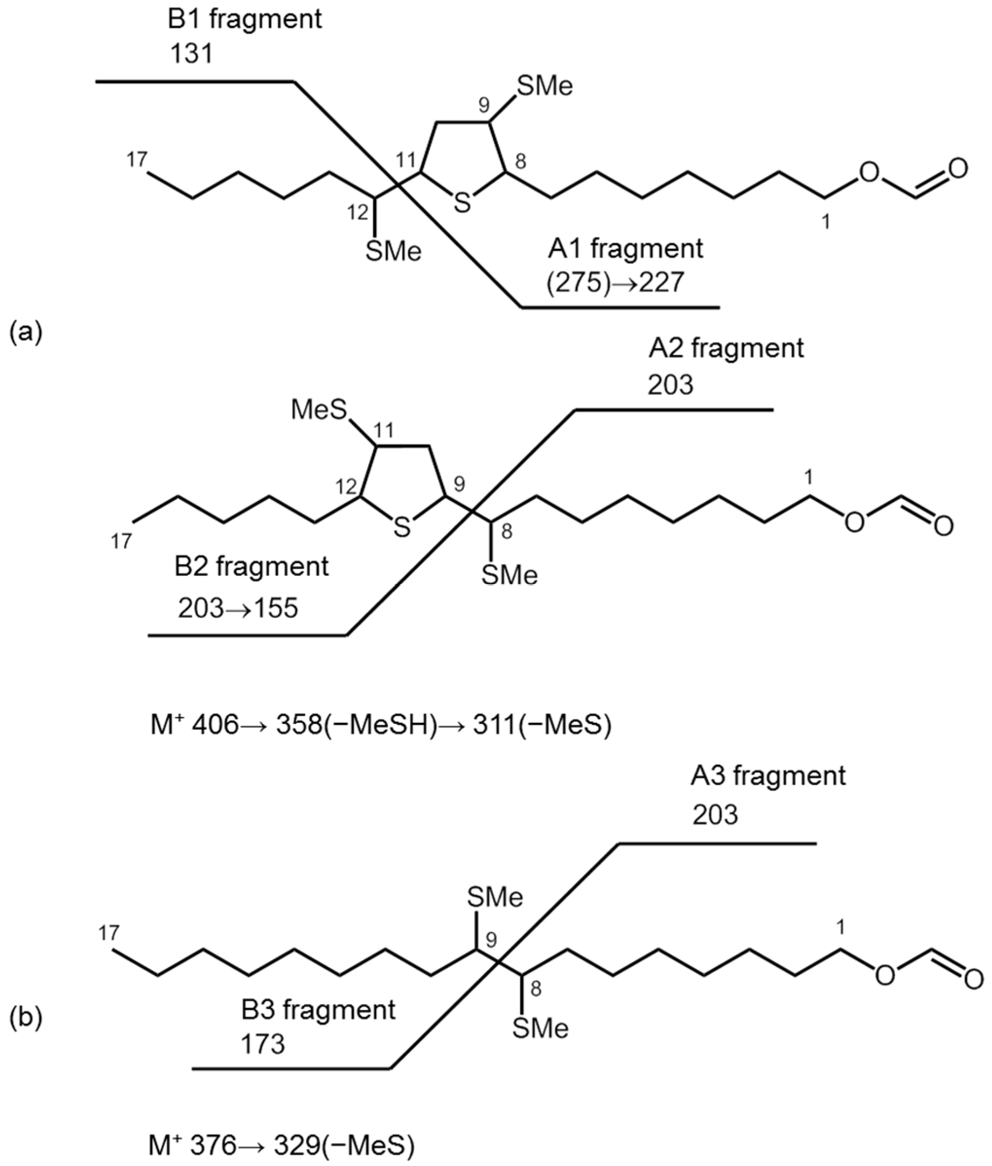 Mass fragmentation of DMDS derivatives derived from (a) compound 1 and (b) compound 2.