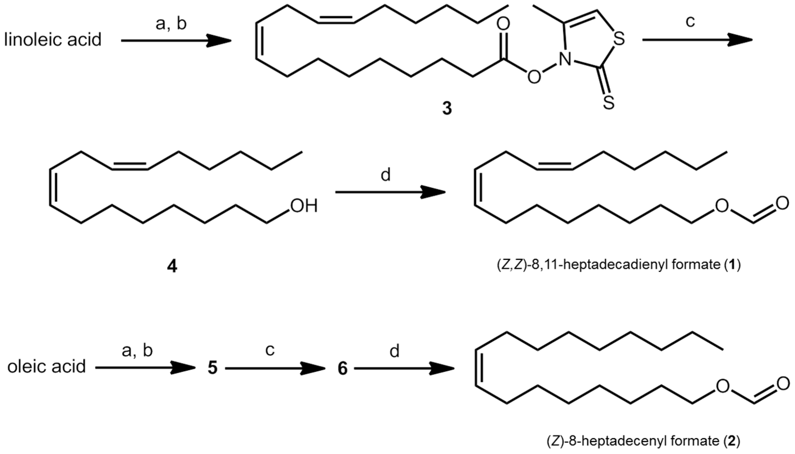 Formate 2 was easily prepared using OA as the starting material following the same synthetic route used for compound 1. As the GC retention times, MS spectra, and 1H-NMR spectra of the synthesized compounds 1 and 2 exactly match those of the natural products, compound 1 and compound 2 are confirmed as (Z,Z)-8,11-heptadecadienyl formate and (Z)-8-heptadecenyl formate, respectively.