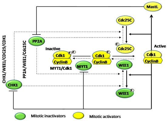Mitosis regulators can push cells forward into mitosis or hold them in G2-arrest. Both WEE1 and its complementary counterpart, cell division cycle 25C (Cdc25C), represent the main switch for mitosis by means of double-activating feedback loops. Thus, in order to facilitate the progression of mitosis, activated cyclin-dependent kinase 1 (Cdk1) activates and inactivates its activators (Cdc25C and MastL) and inactivators (WEE1 and MYT1 (membrane associated tyrosine/threonine 1) kinases), respectively [74,75,76]. There are three parallel Cdk1-inactivating pathways: CHK1/WEE1/Cdc25C/ Cdk1, MYT1/Cdk1, and PP2A/WEE1/Cdc25C [74] (Figure 1).