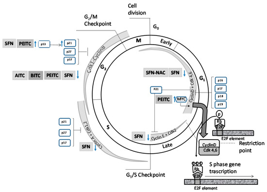 Effects of ITCs in vitro on cell cycle regulation by Cdk/cyclin holoenzymes and CKIs. Abbreviations: ↑, enhanced expression or protein levels; ↓, reduced expression or protein levels; AITC, allyl isothiocyanate; BITC, benzyl isothiocyanate; PEITC, phenethyl isothiocyanate; SFN, sulforaphane; SFN-NAC, N-acetylcysteine conjugate of sulforaphane.