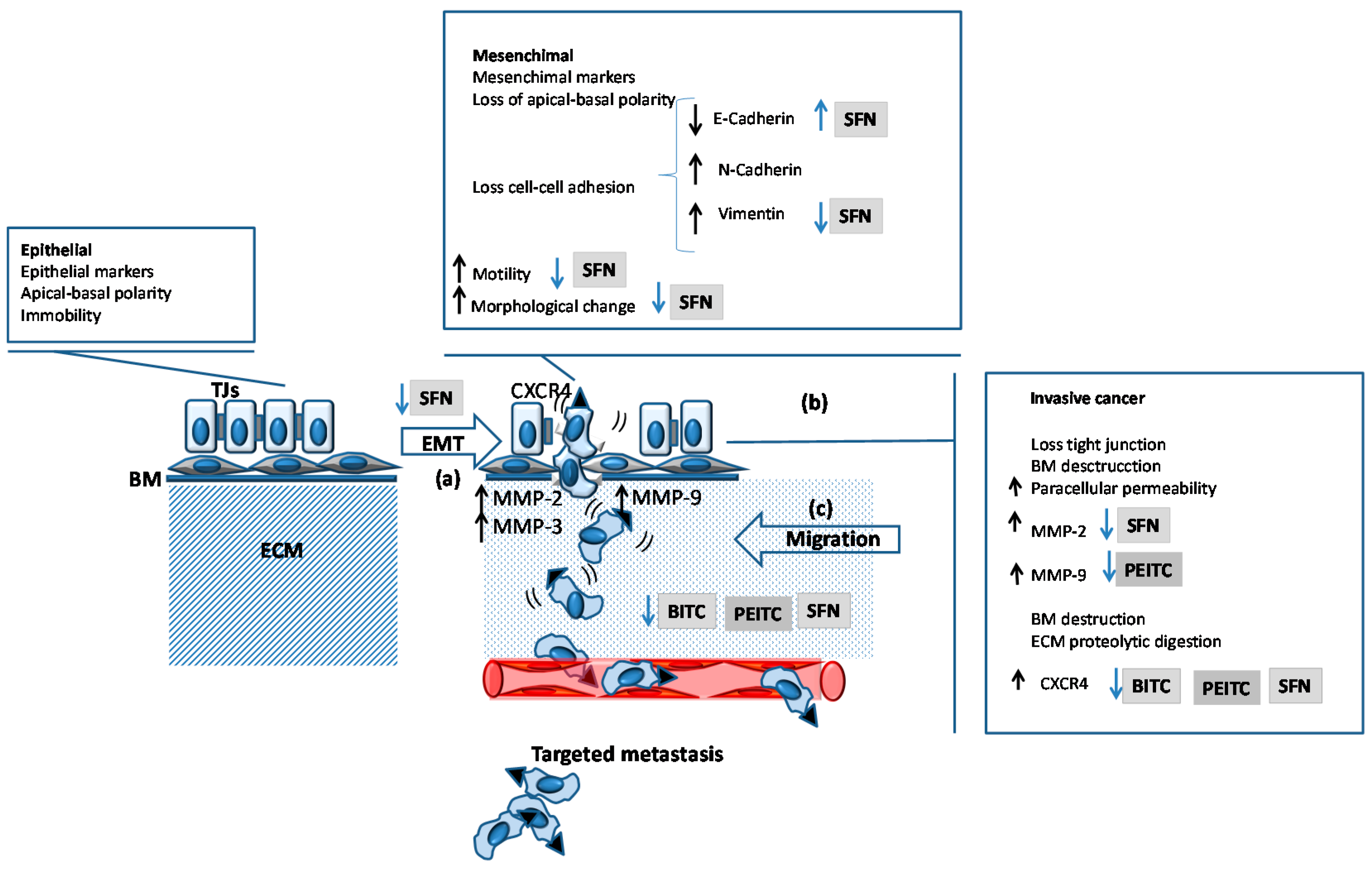 Schematic representation of the inhibitory effects of ITCs on EMT and invasion-metastatic mechanism in PCa cells in vitro. (a) During EMT epithelial cells decrease adhesion, change their morphology, polarity and position. EMT is characterized by a dowregulation (↓ bold arrow) and upregulation (↑ bold arrow) of genes that are characteristic of an epithelial and mesenchymal phenotype, respectively; The invasive (b) and migration (c) capacities are increased in the cells overexpressing CXCR4, MMP-2, MMP-9, MMP-3 (↑ bold arrow). Inhibitory effects of ITCs are represented by blue arrows (↑, enhanced expression, activity or protein levels; ↓, reduced expression, activity or protein levels). Abbreviations: BITC, benzyl isothiocyanate; BM, basement membrane; CXCR4, chemokine receptor type 4; ECM, extracellular matrix; EMT, epithelial- mesenchymal transition; MMP-2, matrix metalloproteinases (gelatinase-A); MMP-9, matrix metalloproteinases (gelatinase-B); PEITC, phenethyl isothiocyanate; SFN, sulforaphane; SFN-NAC, N-acetylcysteine conjugate of sulforaphane; TJs, tight junctions.