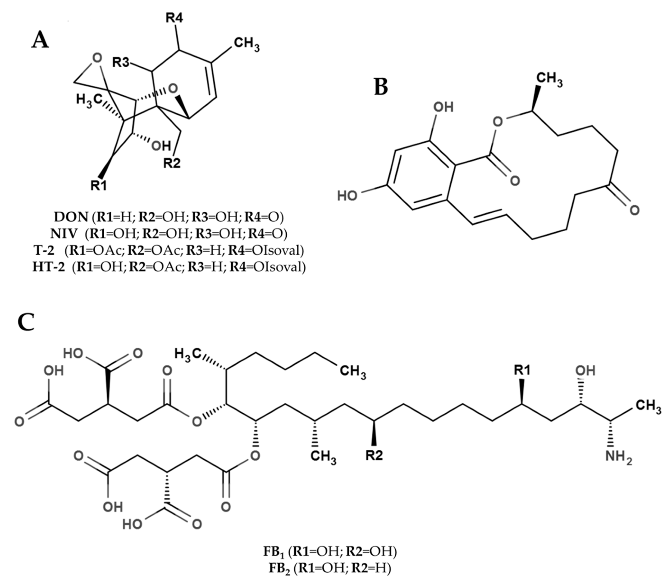 The most common Fusarium mycotoxin groups are trichothecenes, zearalenones and fumonisins (Figure 1); however, other mycotoxins (enniatins, moniliformin, beauvericin and fusaproliferin) can be identified in combination with the above-mentioned toxins [45].