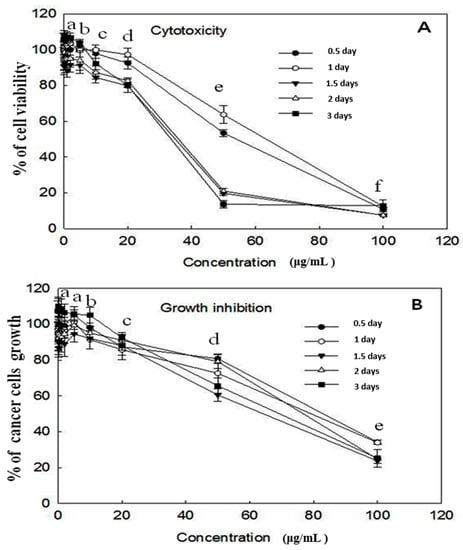 (A) Cytotoxicity effect of 1,3-BPMU on HEP-G2 hepatoma cells. The cells were treated with different concentrations of 1,3-BPMU in 10% FBS-DMEM and incubated for 0.5, 1.0, 1.5, 2.0 and 3 days at 37 °C. The maximum cytotoxicity was exhibited at the concentrations of 50 and 100 μg/mL of 1,3-BPMU; (B) Effect of 1,3-BPMU on HEP-G2 cell growth. The cells were treated with different concentrations of 1,3-BPMU in serum-free DMEM and incubated for 0.5, 1.0, 1.5, 2.0 and 3 days at 37 °C. 1,3-BPMU exhibited a potent tumor growth inhibition at 100 μg/mL. Different letters, a, b, c, d, e, f, within a treatment between concentrations of 1,3-BPMU indicate significant differences (p < 0.05).