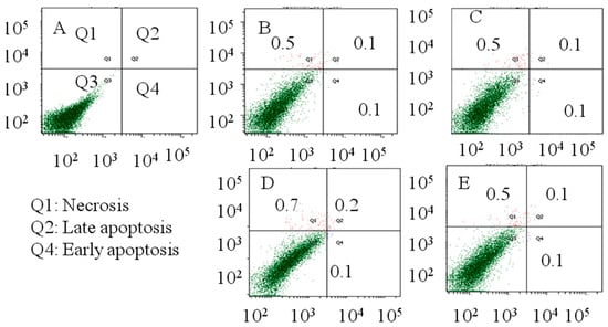 FITC-annexin V (sc-4252 FITC, Santa Cruz biotechnology, Santa Cruz, CA, USA) was used for analyzing the apoptosis, and propidium iodide (PI) reagent (P4170, Sigma) was used for identifying the necrotic cells. Cells were treated with different concentrations of 1,3-BPMU (0.001, 0.1, 0. 2, 0.5, 1, 2, 5, 10, 20, 50 and 100 μg/mL) for 48 h, and then, experimental cells were harvested and resuspended in binding buffer (10 mM HEPES pH 7.4, 150 mM NaCl, 5 mM KCl, 1 mM MgCl2 and 1.8 mM CaCl2) containing FITC-annexin V (1 μg/mL) and incubated for 20 min. About 10 minutes before the end of incubation, PI (10 μg/mL) was added to this cell suspension in order to stain necrotic cells. These cells were analyzed with a FACS flow cytometer (Becton Dickenson Biosciences, San Jose, CA, USA) equipped with an excitation laser line at 488 nm. The PI was collected through a 575 ± 15-nm bandpass filter [38].