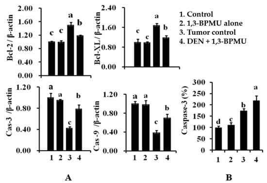 Impact of 1,3-BPMU on apoptotic and anti-apoptotic gene expression in control and experimental animals. (A) Bcl-2, Bcl-XL, caspase-3 and caspase 9 mRNA expression in experimental rats; (B) Quantification of caspse-3 protein expression in experimental rats. Different letters, a, b, c, d, within a treatment between concentrations of 1,3-BPMU indicate significant differences (p < 0.05).
