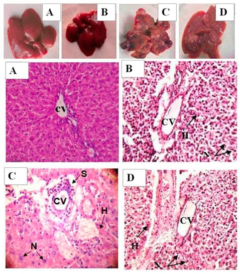 Two to three pieces of liver tissue, approximately 5 mm in size and fixed in 10% formalin solution and embedded in paraffin wax, were stained with hematoxylin-eosin [44,45]. The stained tissues were examined under the high-resolution microscope. For TEM analysis, the tissues were embedded in a mixture of (1:1) 1,2-epoxypropane and Epon (Epikote resin) and hardened using dodecyl succinic anhydride (DDSA) and methylnadic anhydride (MNA). Ultrathin sections were cut and stained with uranyl acetate and lead nitrate and collected on mesh grids coated with a thin Formvar film and viewed in an EM201C transmission electron microscope (Philips, Amsterdam, The Netherlands).