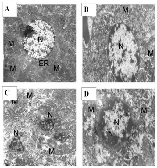 Ultrastructural analysis of liver tissue by transmission electron microscope (TEM). (A) Normal rats; (B) 1,3-BPMU alone; (C) tumor control; (D) DEN + 1,3-BPMU rats. Mitochondria (M), endoplasmic reticulum (ER) and nucleus (N).