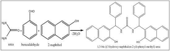 Reaction scheme for 1,3-bis-[(3-hydroxynaphthalen-2-yl) phenylmethyl]urea.